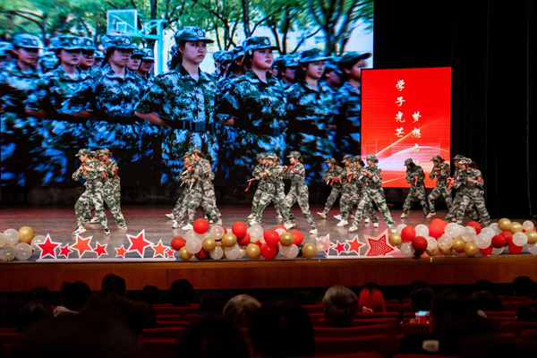 輔導(dǎo)員與學(xué)生代表帶來了青春勵(lì)志歌曲串燒;退役大學(xué)生士兵代表、軍訓(xùn)學(xué)生教官沈斌曉帶領(lǐng)新生女兵,帶來了入列儀式和匕首操表演。