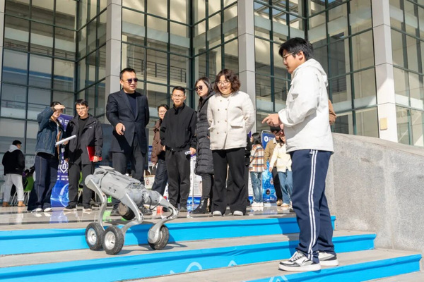 開幕式結束后,師生移步至31幢二樓平臺,參觀豐富多彩的AI科技互動展覽。現場設有成果展區、實物展區與黨建AIGC紅色影像作品展。智能機器狗、采摘機器人、機械臂等設備一一亮相,學生負責人細致講解研發過程與技術特點,引發熱烈討論。AI陪伴機器人展區也吸引了眾多師生駐足互動,現場氣氛活躍。