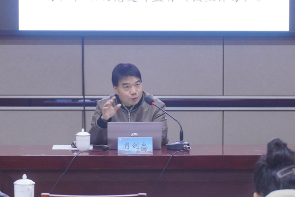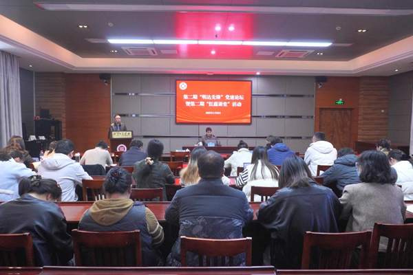 11月26日下午,學校第二期“明達先鋒”黨建論壇暨“紅蘊人文”組織員工作室第二期“紅蘊課堂”活動在明達樓230會議室舉辦。活動特邀浙江工業大學馬克思主義學院教授、中共浙江省委黨校全面從嚴治黨研究中心研究員肖劍忠作題為“如何高質量開展黨建研究工作”的專題講座。校黨委組織部副部長郭勝,“四強”組織員培養對象、在湖高校骨干組織員培養對象等30余人參加活動。活動由人文學院黨委書記程龍主持。
