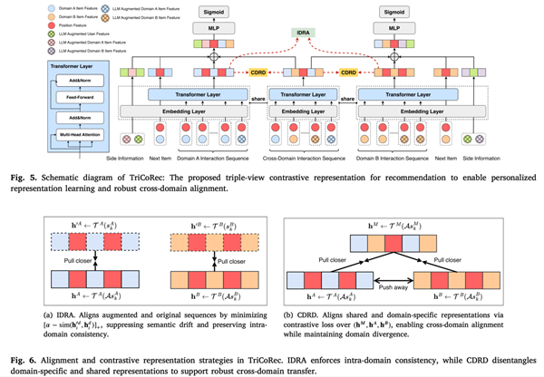該研究針對(duì)聯(lián)邦跨域推薦系統(tǒng)中普遍存在的數(shù)據(jù)極度稀疏、非獨(dú)立同分布(Non-IID)以及差分隱私噪聲導(dǎo)致的性能下降等關(guān)鍵挑戰(zhàn),提出了一種全新的聯(lián)邦跨域點(diǎn)擊率預(yù)測(cè)框架——FedTriCTR-LLM。該框架創(chuàng)新性地引入了大語(yǔ)言模型(LLM)驅(qū)動(dòng)的數(shù)據(jù)增強(qiáng)網(wǎng)絡(luò)(LLMAugNet),利用大模型的語(yǔ)義知識(shí)豐富用戶行為序列;同時(shí)設(shè)計(jì)了三視圖對(duì)比推薦模塊(TriCoRec),通過視圖內(nèi)對(duì)齊和跨域解耦機(jī)制,有效提升了模型在異構(gòu)數(shù)據(jù)下的魯棒性。此外,研究還提出了一種自適應(yīng)剪裁差分隱私機(jī)制(AdaClipDP),在保證嚴(yán)格隱私安全的同時(shí)顯著降低了噪聲對(duì)模型精度的影響。實(shí)驗(yàn)結(jié)果表明,該方法在Amazon和Douban等多個(gè)真實(shí)數(shù)據(jù)集上均取得了優(yōu)于現(xiàn)有最先進(jìn)基準(zhǔn)模型的性能。