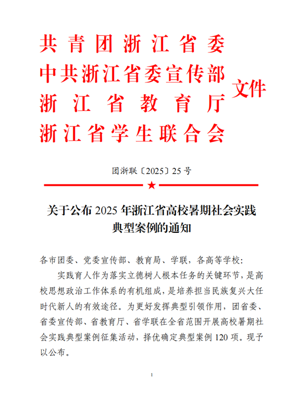 近日,團省委、省委宣傳部、省教育廳、省學聯(lián)公布了2025年浙江省高校暑期社會實踐典型案例評選結果,校團委2項調研報告獲評“美麗中國”“中國之治”典型案例。
